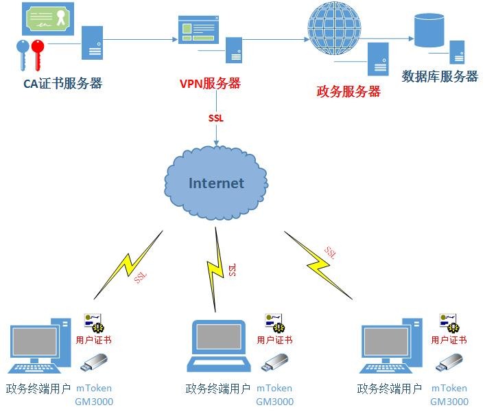 龍脈科技mToken身份認證鎖作為新一代客戶端身份認證產品,內置高性能安全智能卡芯片,以硬件設備作為數字證書的載體,個人認證密鑰可在USBKEY內生成,并且個人密鑰永不出鎖,采用“USBKEY+PIN碼”的雙因子認證,大大提高了個人密鑰的安全性。為了保證電子政務認證應用的安全,方案采用龍脈科技mToken作為介質建立SSL虛擬專用通道的電子政務解決方案。